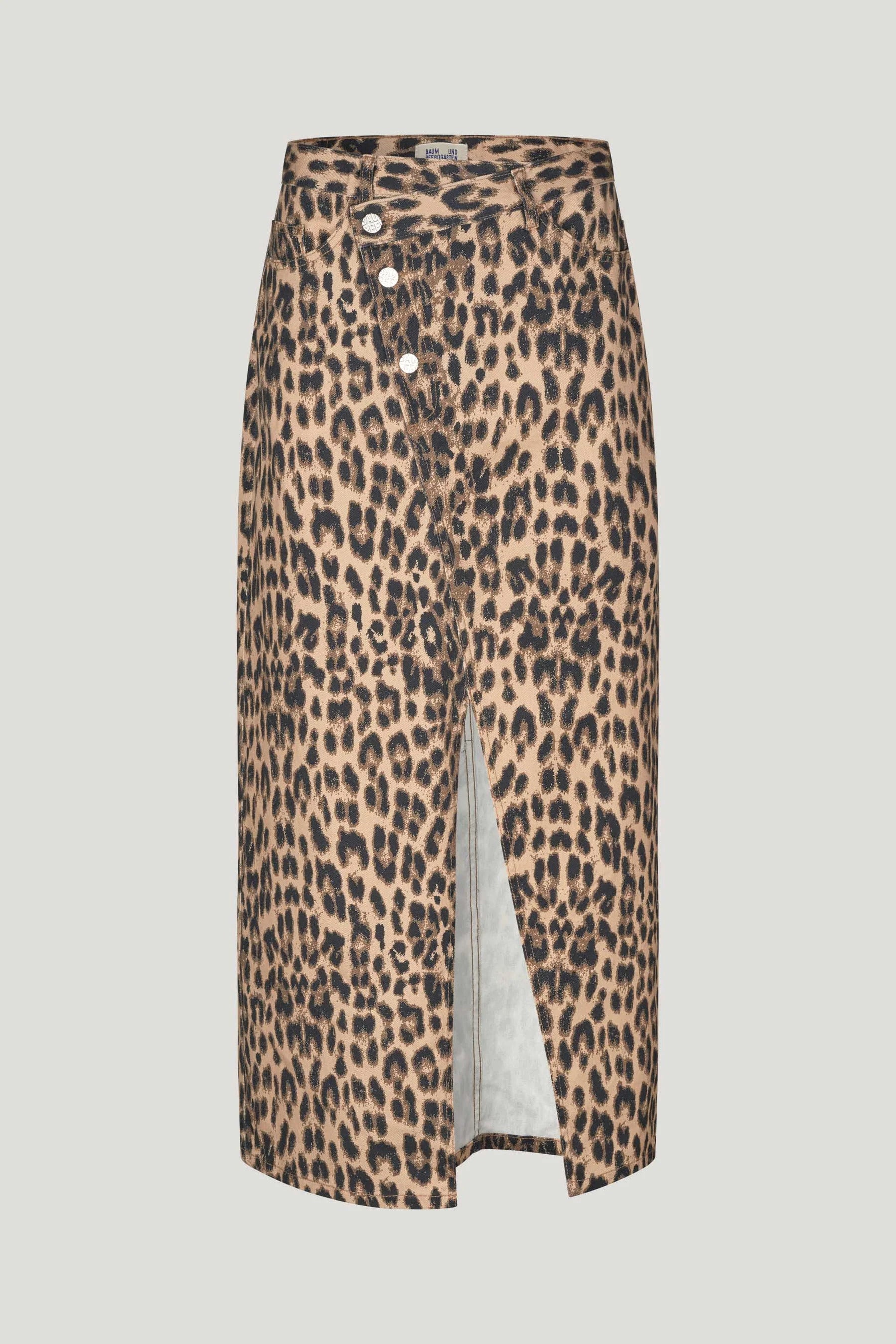 Dieser mittelhohe Maxirock aus Denim hat asymmetrische Knopfverschlüsse, fünf Taschen und einen langen Schlitz vorne. Der Stoff ist leicht dehnbar.