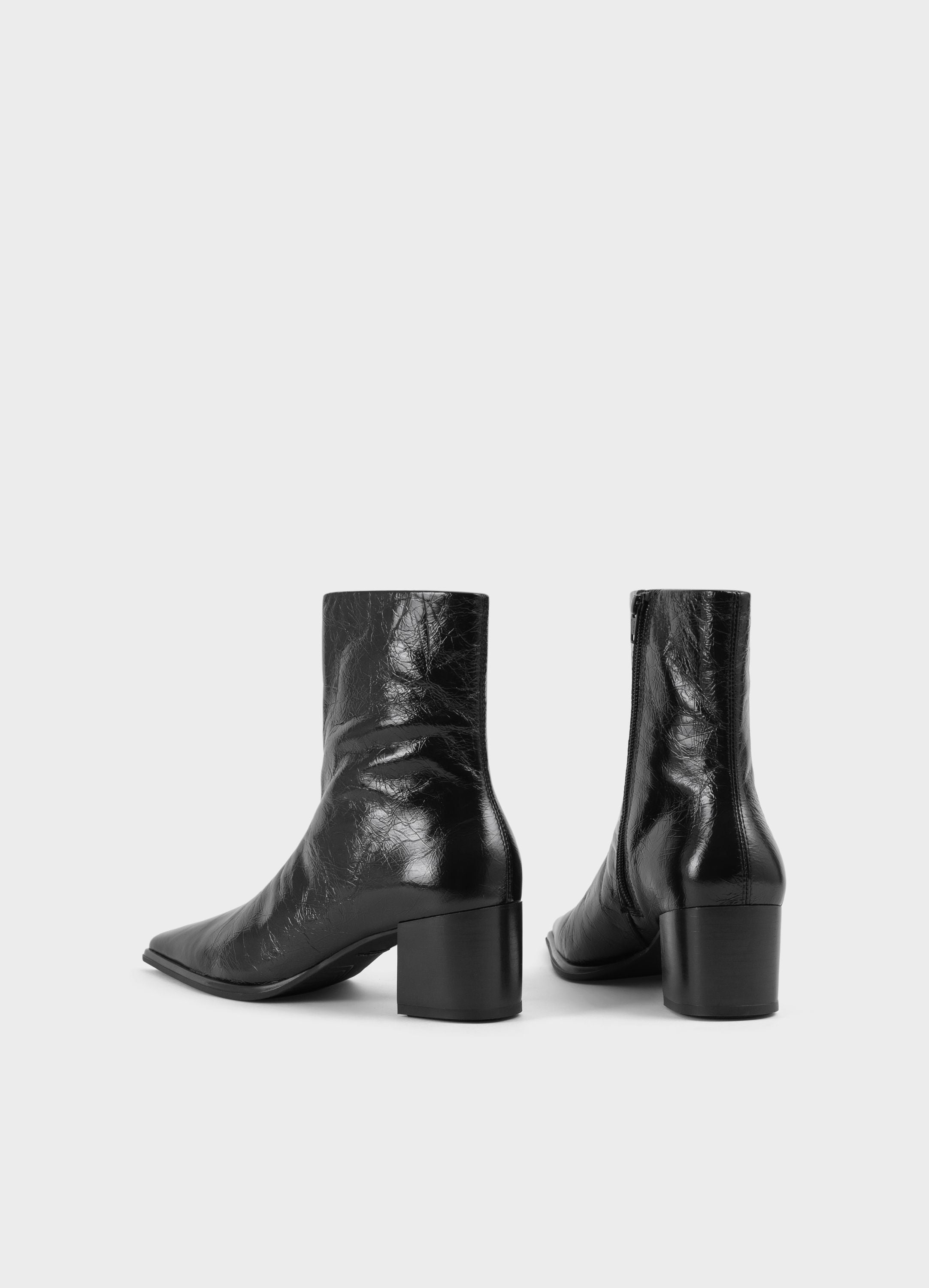 Giselle ist eine schlanke Stiefelette mit einem schicken Look. Das Modell ist aus schwarzem Lackleder gefertigt, hat eine spitze Zehenpartie und einen seitlichen Reißverschluss. Die eleganten Blockabsätze sind 5,7 cm hoch.