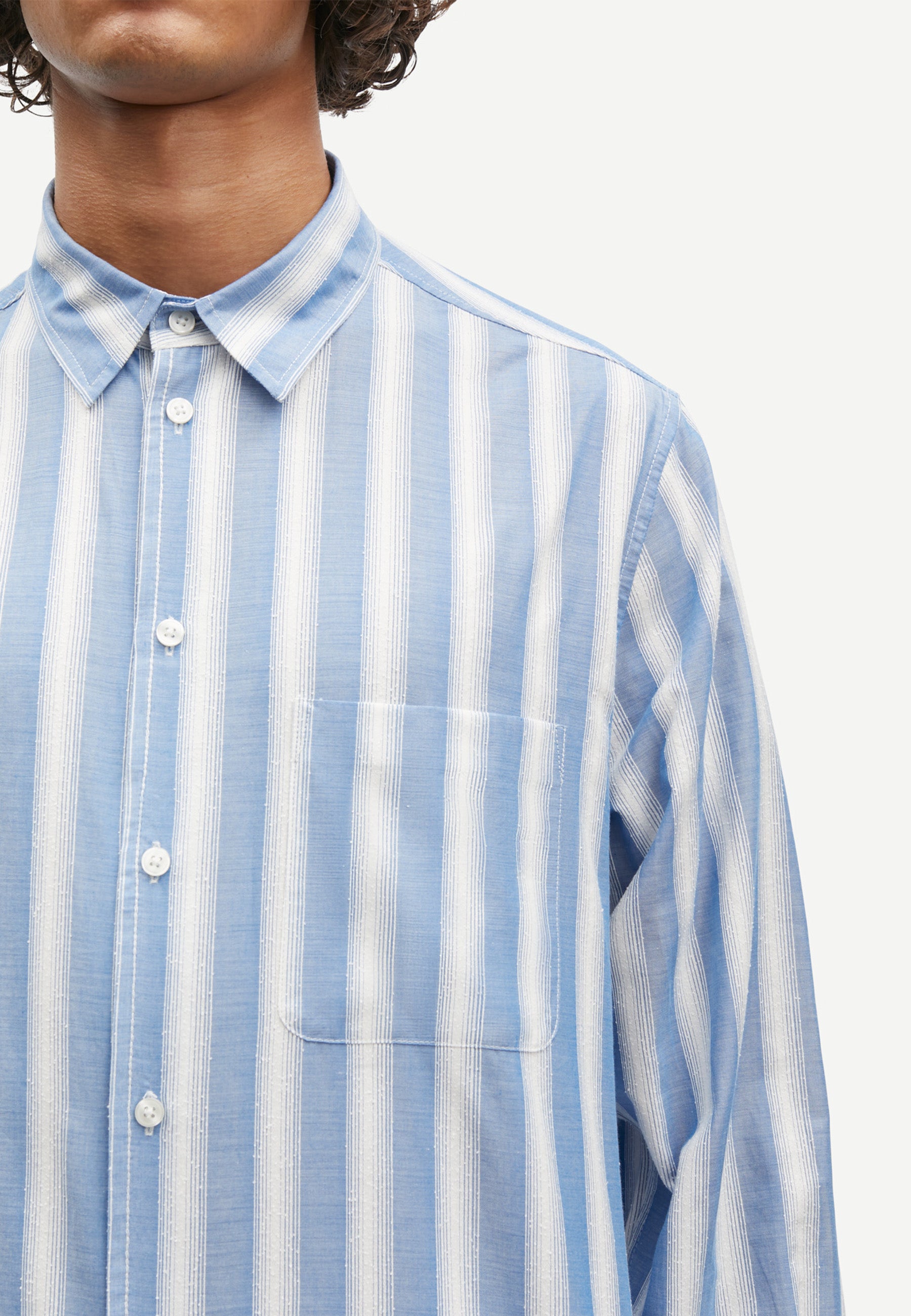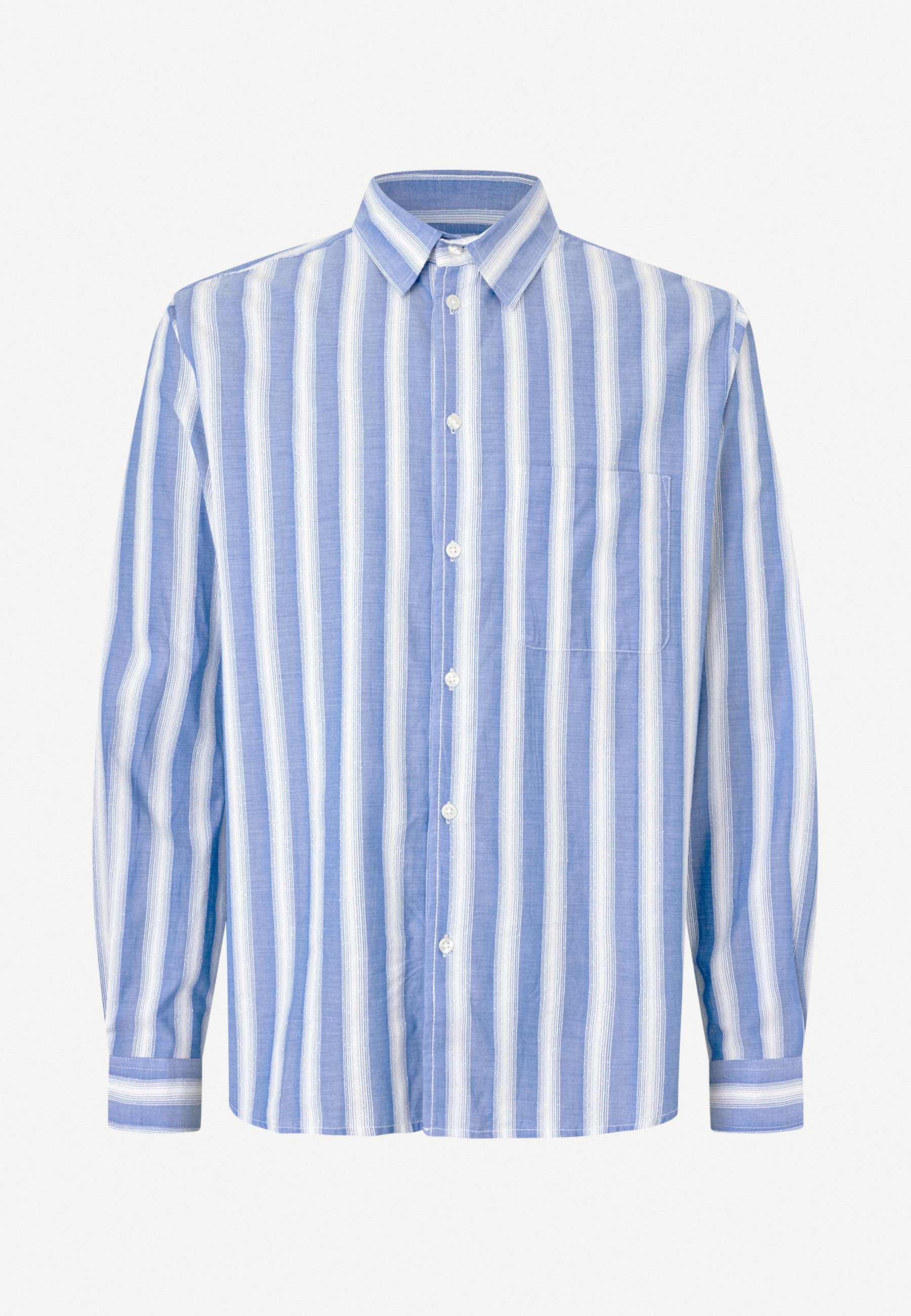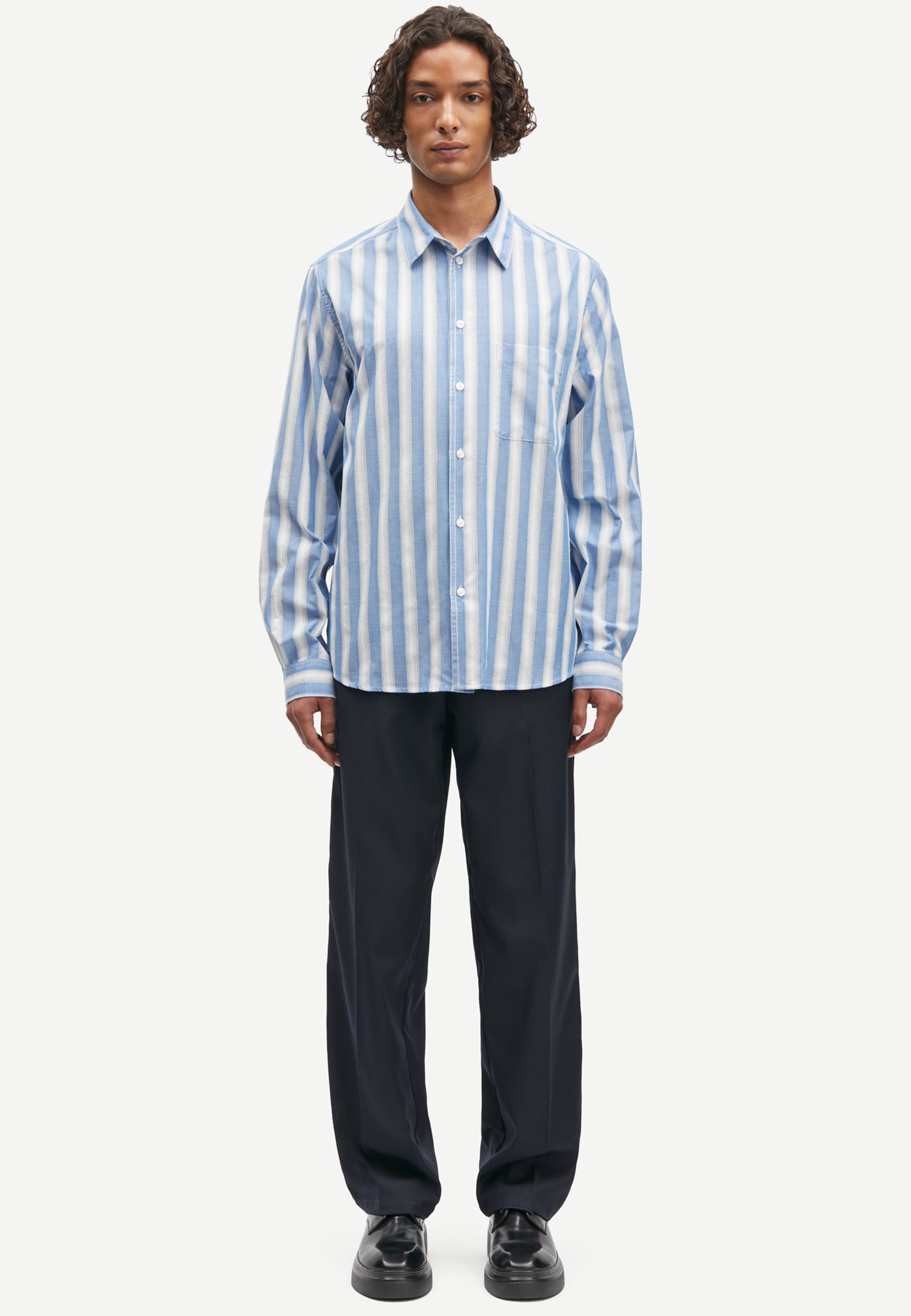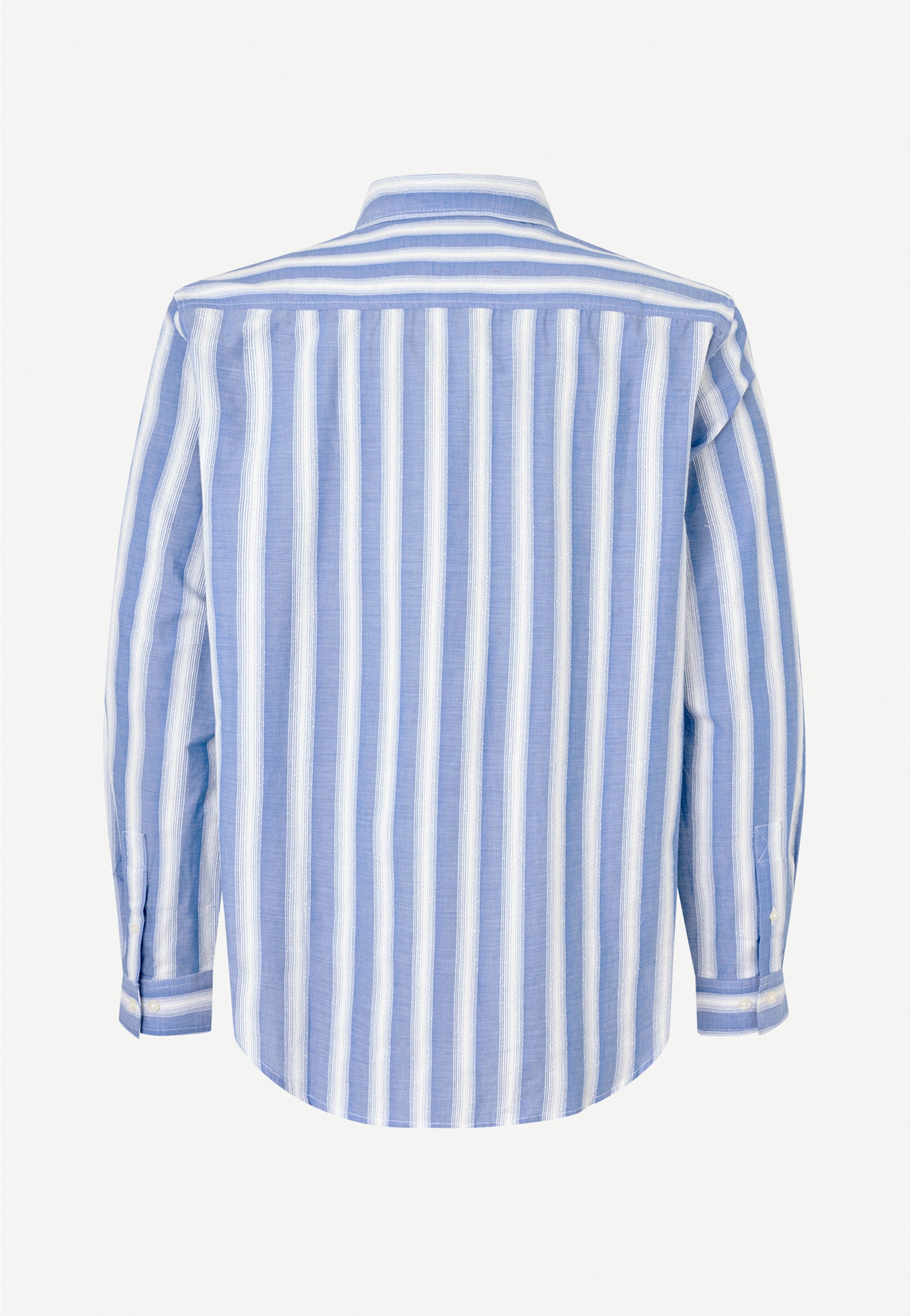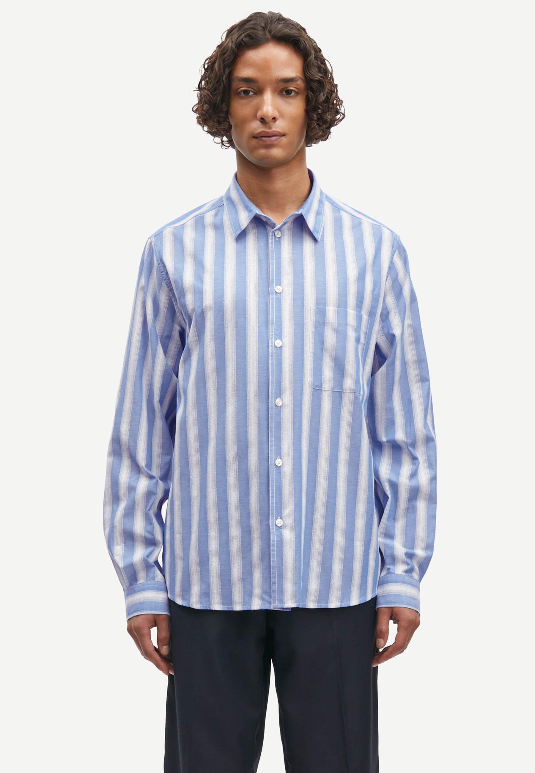 Gestreiftes Langarm-Hemd mit normaler Passform. Knopfverschluss auf der Vorderseite und geknöpfte Manschetten. Aufgesetzte Tasche auf der Vorderseite. Naht an der Passe.
