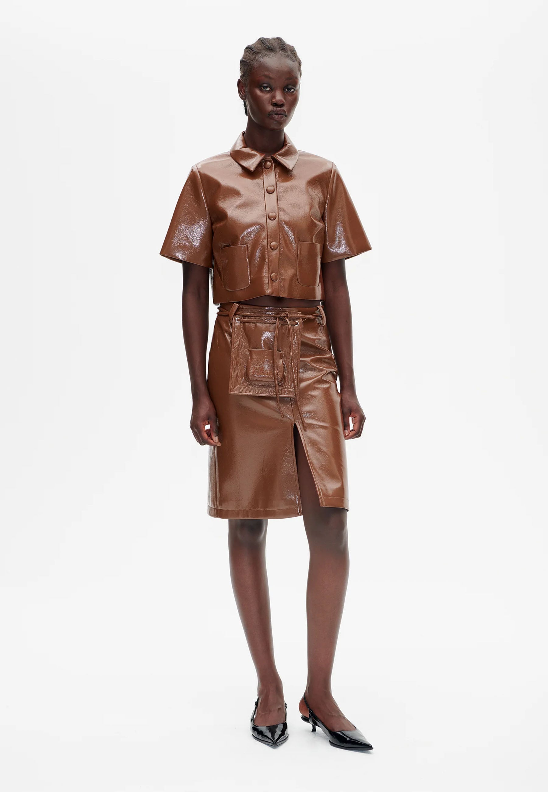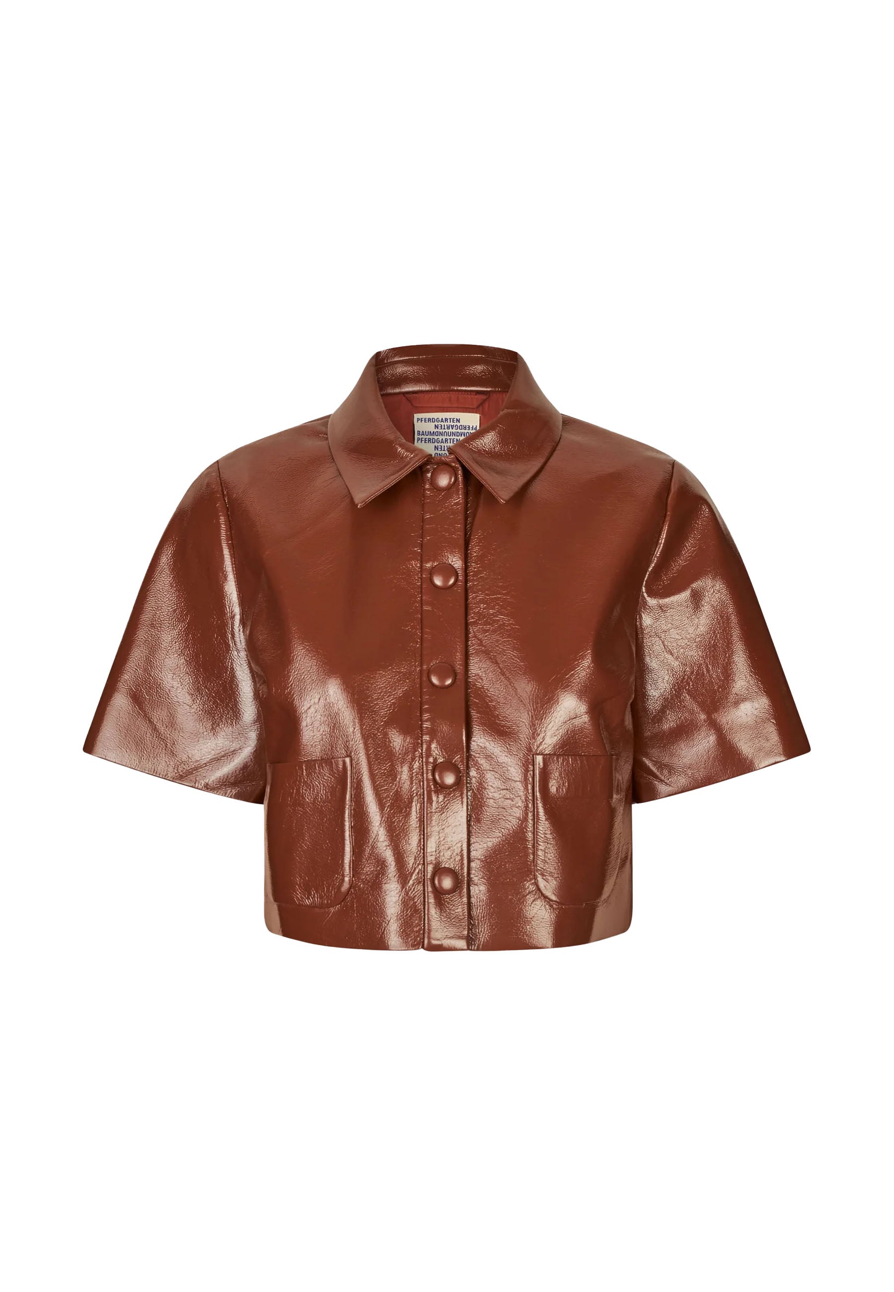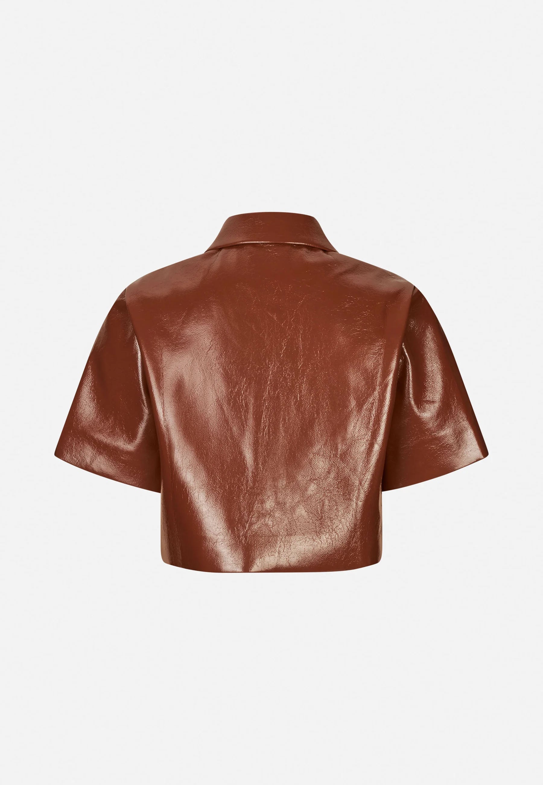 Die Jacke Beth ist eine Kurzjacke in Lackoptik, die jedem Outfit einen glänzenden, ausgefallenen Touch verleiht. Mit klassischem Kragen und Druckknopfverschluss auf der Vorderseite verbindet es zeitloses Design mit einem modernem, modischem Anspru